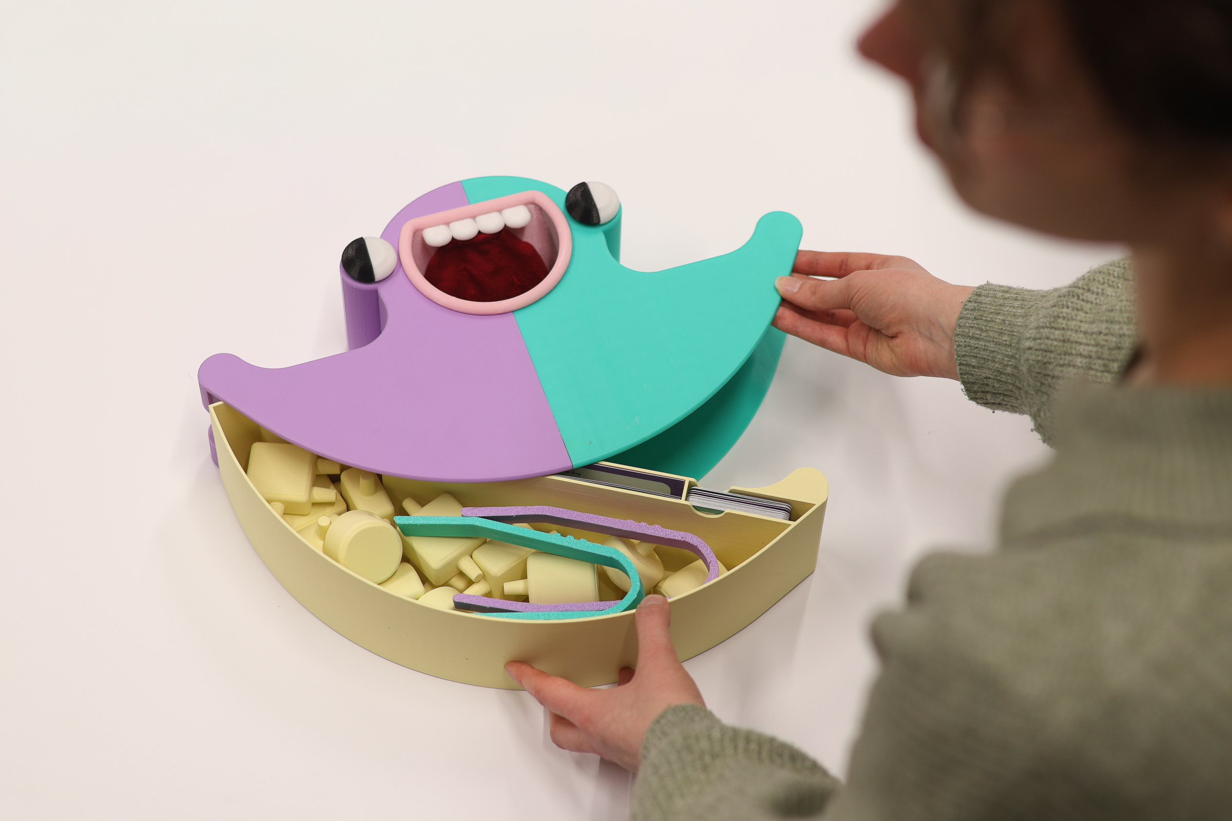 Logopeda mocuje magnetyczny język-pacynkę wewnątrz buzi Logostworka. Dziecko widzi dokładny układ artykulacyjny w 3D.