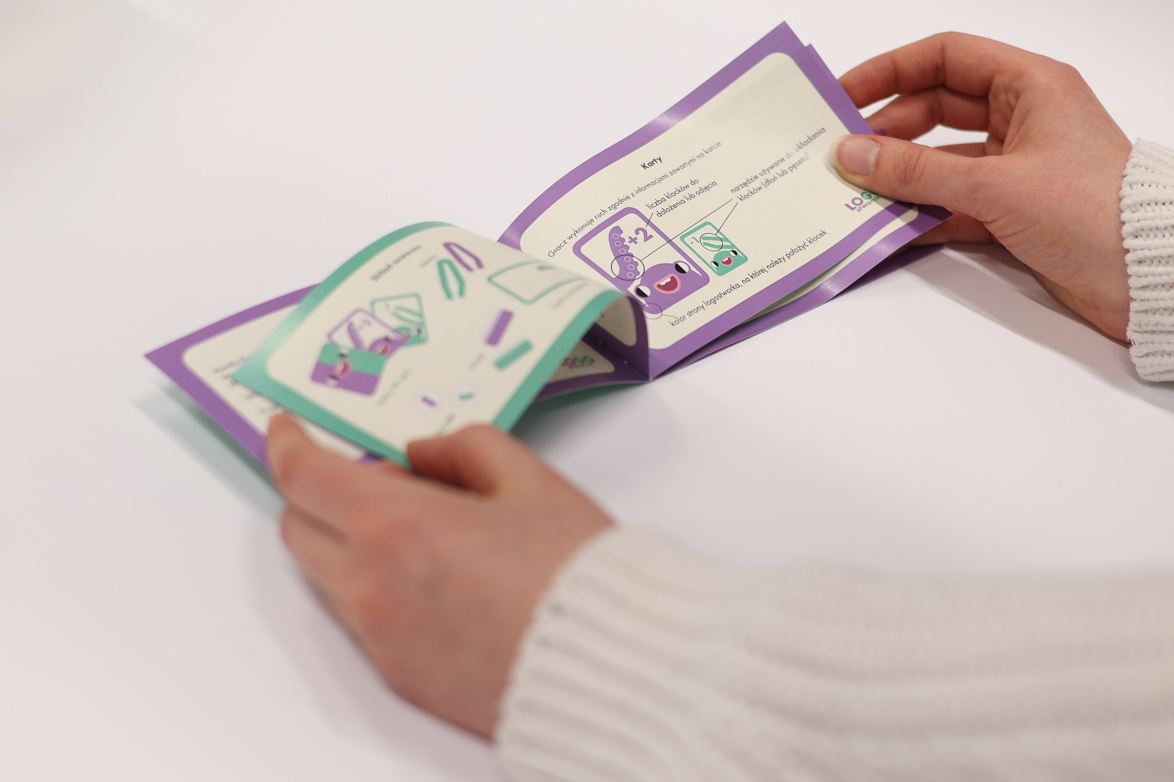 Dziecko powtarza zadane słowo, np. szafa czy strzykawka. Po poprawnej realizacji losuje kartę, która dyktuje ruch w grze.